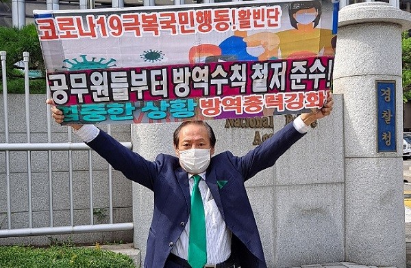 ▲7일 오전 홍정식 활빈단 대표가 서울 경찰청 본청 정문 앞에서 ‘공무원들부터 방역수칙 철저준수’라고 적힌 손현수막을 펼치며 1인 퍼포먼스를 하고 있다. 홍정식 대표 제공 |