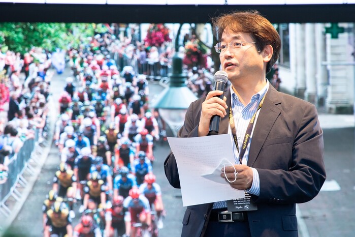 ▲ 이동환 고양특례시장이 도심형 자전거 대회 ‘킹오브트랙(KING OF TRACK)’ 개최 환영사를 하고 있다. 고양시 제공 |