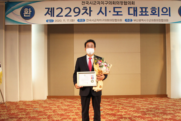 [로컬세계 맹화찬 기자]부산시 남구의회 백석민 의장은 지난 17일 해운대 그린나래호텔에서 개최된 ‘전국시군자치구의회의장협의회 제229차 시·도대표회의’에서 제8대 의회 의정활동 실적과 지역현안문제 해결 및 의장으로서 원활한 의회 운영을 위한 공적을 인정받아 '지방의정봉사상'을 수상했다.