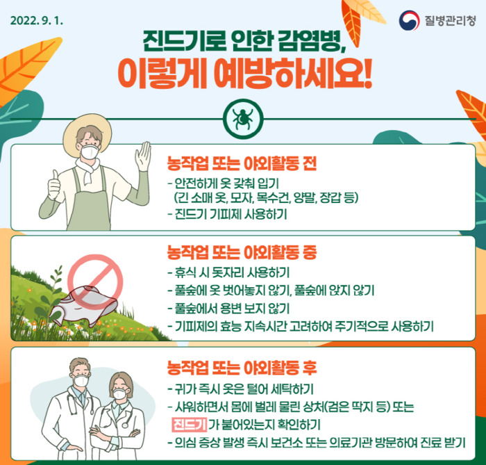야외활동 시 피부 노출을 최소화하는 복장(긴 소매, 긴 바지, 모자 등)을 착용하고 진드기 기피제를 사용하는 것이 안전하며, 야외활동 직후 옷은 바로 세탁해야 한다.
