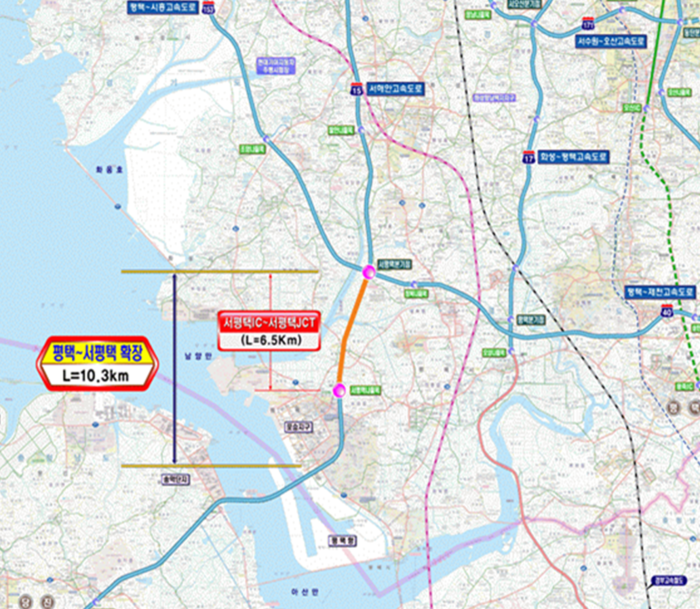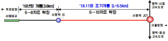 국토교통부는 서해안고속도로 평택-서평택 간 확장공사 10.3km 가운데 상습 지정체 지역인 서평택IC-서평택JCT 구간(6.5km, 왕복 6→10차로)을 오는 27일 오후 2시에 조기 확장 개통한다고 밝혔다.