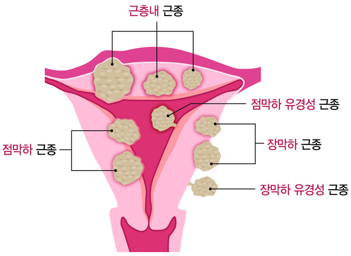 자궁근종은 발생 위치에 따라 크게 △자궁 근육층에서 발생할 경우 근층내 근종, 자궁 바깥쪽 점막에서 발생하는 장막하 근종, △그리고 자궁 안쪽에 발생하는 점막하 근종, △자궁의 바깥쪽으로 줄기를 형성하여 매달린 듯 발생하는 유경성 근종으로 분류한다.