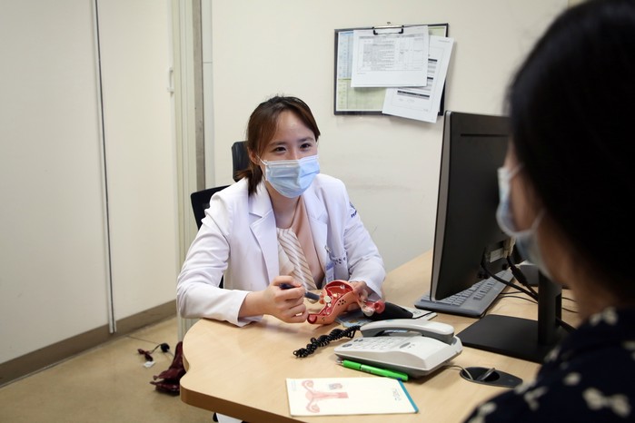 ▲강동경희대병원 산부인과 한관희 교수가 한 여성 환자와 진료 상담하고 있다. |