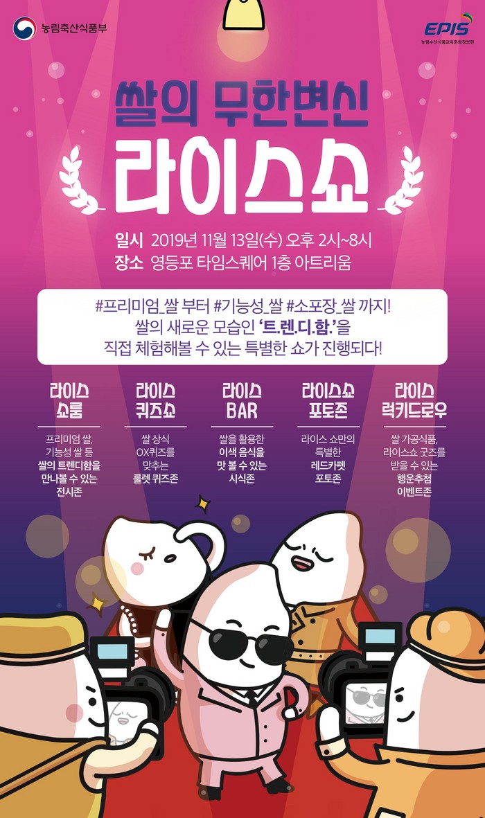 부대 행사로는 ‘라이스쇼 레드카펫 포토존’을 마련하여 다양한 쌀 캐릭터들과 기념사진을 남길 수 있으며,