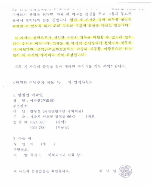 ㅇ 2002년 05월 10일 : ‘아들이 치료를 받은 후 현역으로 입대할 수 있도록 해달라’고 병무청에 요청한 당일 이 지명자는 ‘아들이 치료와 재활을 거쳐 신성한 국방의 의무를 다할 수 있도록 입대하게 해주기 바라며 현역 복무가 어렵다면 공익근무요원으로 근무할 수 있게 해달라’는 내용의 탄원서를 병무청 중앙신체검사소 운영관 앞으로 제출함. 중앙신체검사소장은 열흘 후인 5월 20일자로 ‘5월 17일에 실시한 신체검사 결과 5급 판정을 받아 현역복무나 공익근무요원 복무가 가능하게 해달라는 귀하의 요구를 수용할 수 없다’고 알려옴