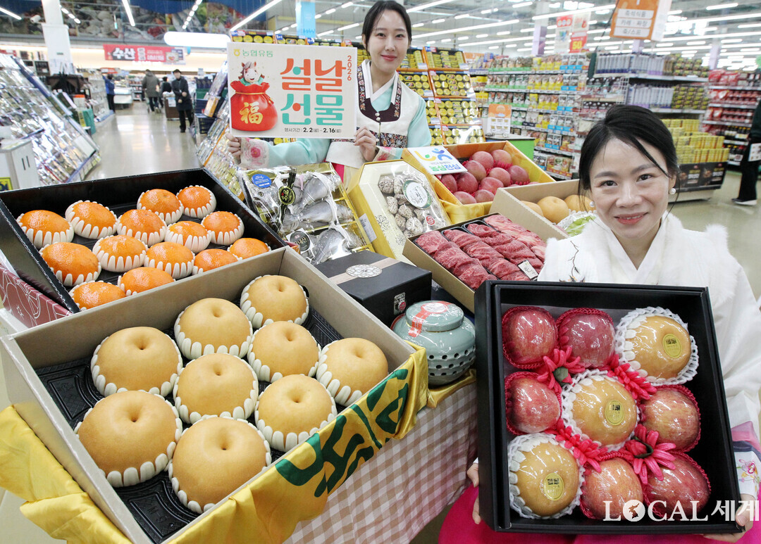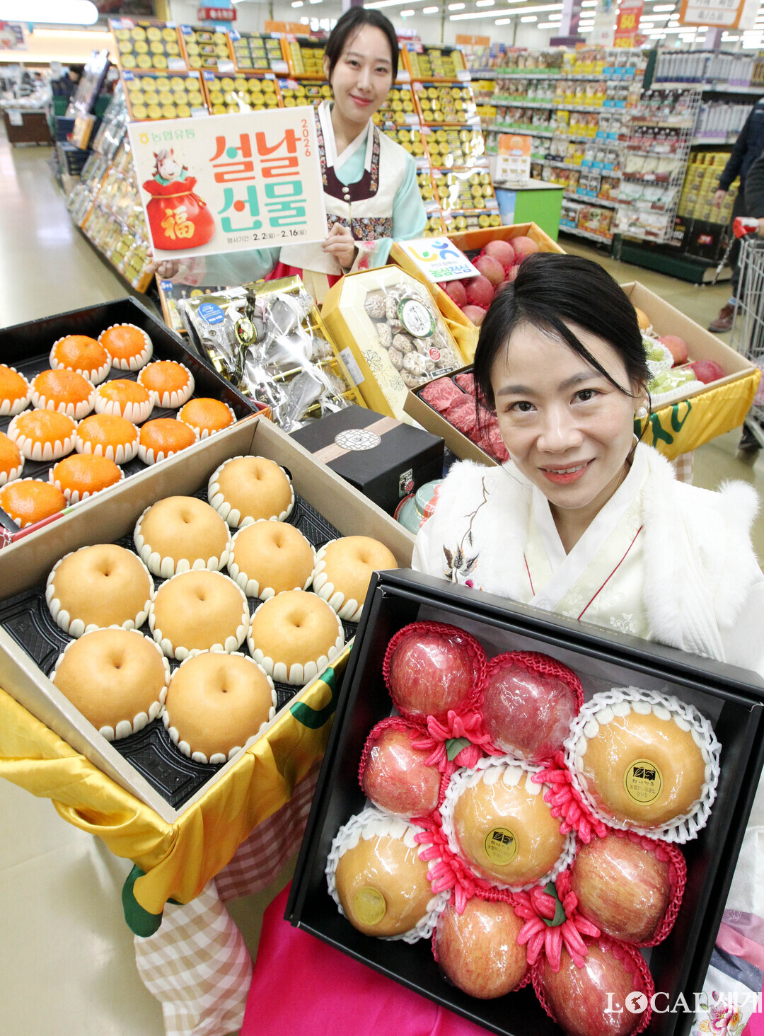 2일 서울 서초구 하나로마트 양재점에서 모델들이 2월 2일부터 진행되는 하나로마트 설 선물 세트 본격 판매 행사를 소개하고 있다.