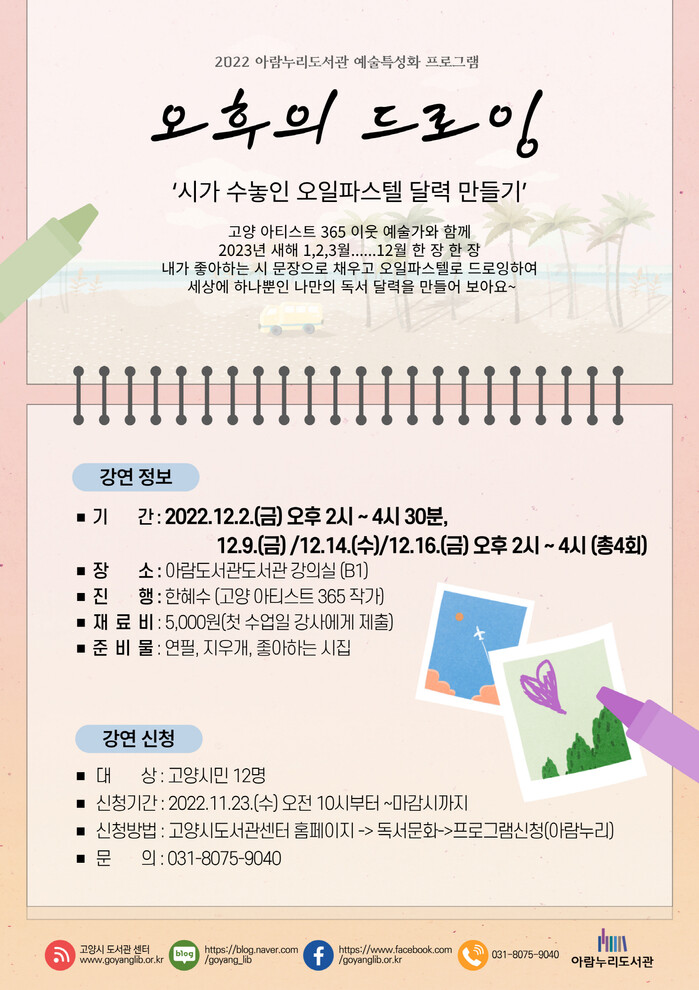 '오후의 드로잉'은 고양아티스트 365 한혜수 작가와 함께 2023년 월별로 좋아하는 시집 문구를 적고 오일파스텔로 드로잉하여 나만의 새해 독서 달력을 만드는 프로그램이다.
