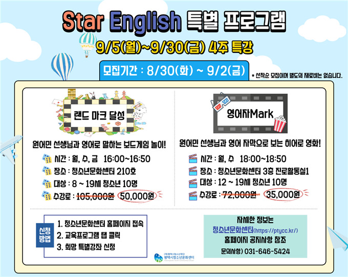 9월 5일부터 30일까지 4주간 청소년들이 관심 있어 하는 다양한 활동을 통해 영어를 배울 수 있도록 특별 프로그램을 운영할 예정이며, 모집기간은 8월 30일부터 9월 3일까지이다.