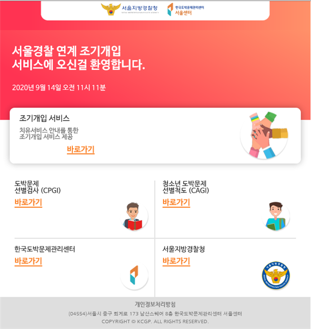 ▲서울센터-서울지방경찰청 연계 온라인 조기개입 시스템 화면. 경찰 조사를 받은 도박행위자 및 민원인은 조기개입 서비스를 통해 도박문제 예방 정보와 치유서비스 안내 문자 서비스를 수신할 수 있다./사진제공=한국도박문제관리센터 |