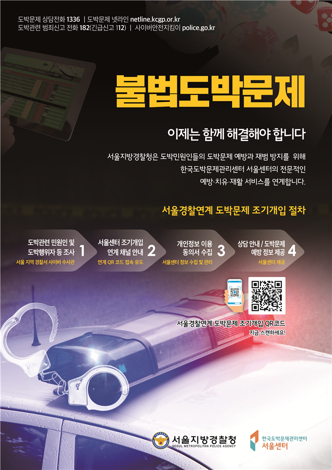 한국도박문제관리센터 서울센터와 서울 지방경찰청 사이버안전과는 21일부터 도박행위자의 재범방지와 치유서비스 연계를 위한 '온라인 도박문제 조기개입 서비스'를 시행한다고 밝혔다.