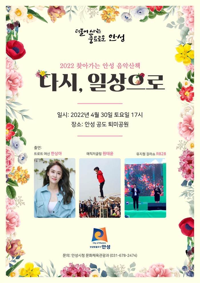 [로컬세계 김병민 기자]경기 안성시는 오는 30일 오후 5시 공도 퇴미공원에서 ‘다시 일상으로 2022 찾아가는 안성 음악산책’ 공연을 개최한다고 밝혔다.