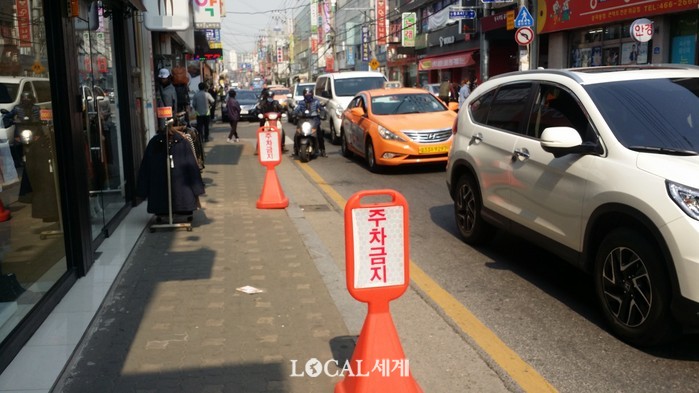 또한 시민들의 보행권도 보장받지 못하고 있다. 여기에 상인들이 불법주차를 막기 위해 놓은 주차금지 표지판도 쾌적한 보행을 가로막는다.