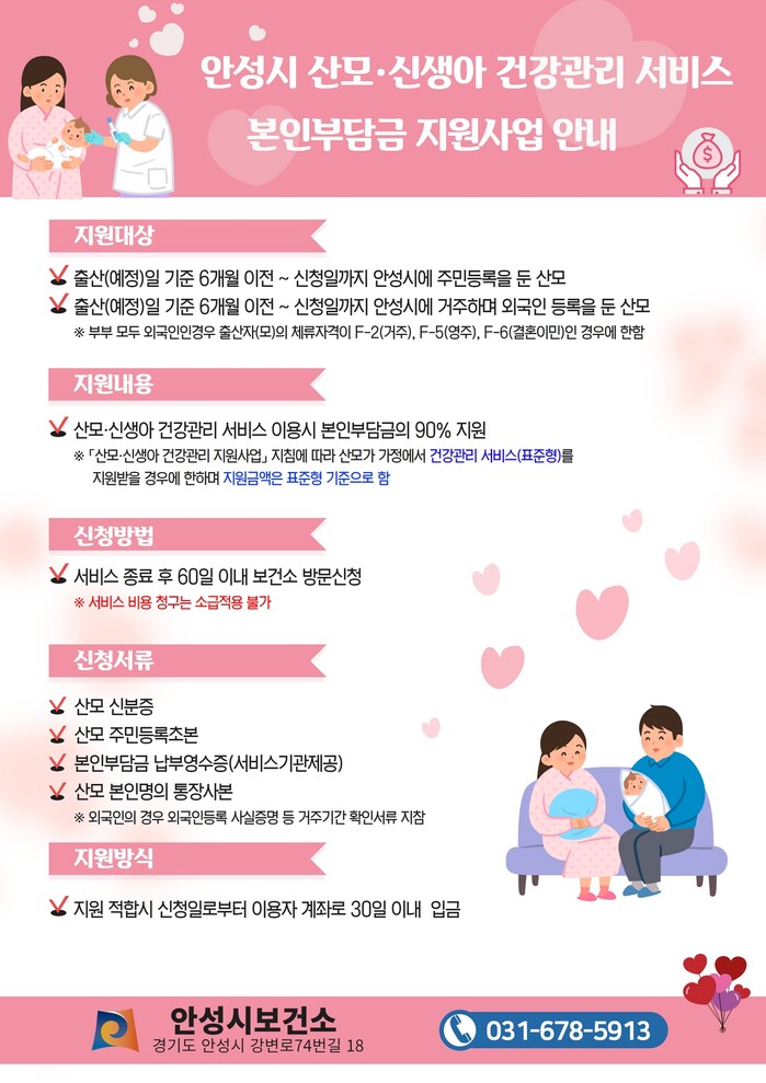 [로컬세계=김병민 기자]경기 안성시보건소는 출산가정의 경제적 부담을 경감하기 위해 ‘산모・신생아 건강관리 서비스’의 본인부담금을 지원한다고 8일 밝혔다.
