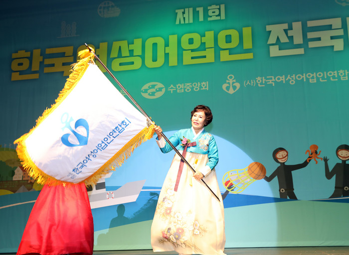 ▲서울 올림픽공원 올림픽홀에서 열린 '제1회 한국여성어업인 전국대회'에 참석한 김춘덕 한국여성어업인연합회 회장이 여성어업인 깃발을 흔들고 있다. |