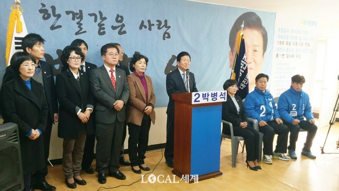 ▲4.13 총선 공식 출마선언 기자회견에는 시‧구의원과 예비후보 등이 참석해 박병석 의원을 지지하고 있다. 조윤찬 기자 |