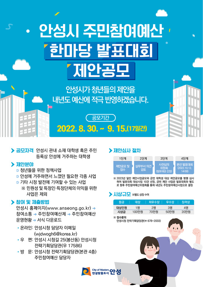 [로컬세계=김병민 기자]경기 안성시(시장 김보라)는 ‘2022년 안성시 주민참여예산 한마당 발표대회 제안공모’를 오는 9월 15일까지 실시한다고 2일 밝혔다.