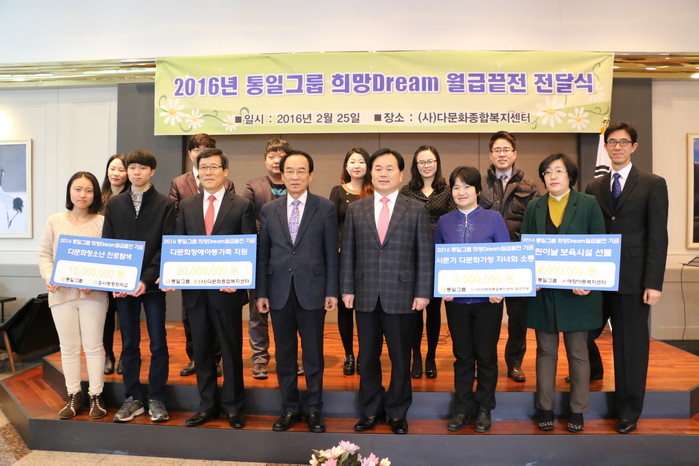 통일그룹은 25일 서울 용산구에 위치한 다문화종합복지센터 1층에서 통일그룹 임직원 대표 등 50여명이 참석한 가운데 월급끝전 4300만원을 기부했다.