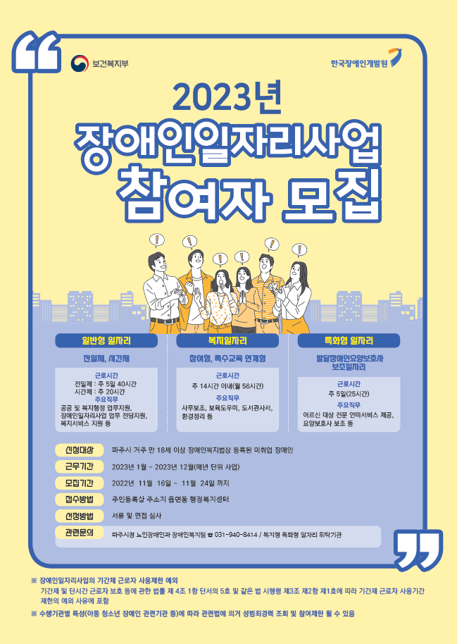 [로컬세계 = 이영원 기자]경기 파주시(시장 김경일)는 취업에 취약한 장애인의 사회참여확대와 소득안정을 지원하기 위해 2023년 장애인일자리사업 참여자를 오는 24일까지 모집한다.