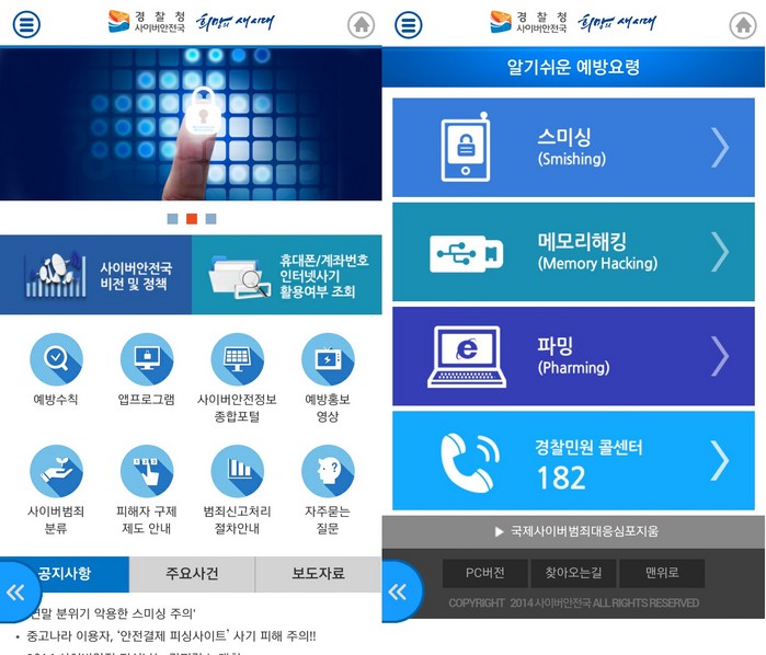 ‘경찰청 사이버캅’을 사용하는 것도 좋은 방법이다. 게임머니 거래시 판매자의 계좌번호와 전화번호가 인터넷 사기에 이용된 번호인지 검색해 볼 수 있으며 신규 스미싱 수법 경보 발령 등 사이버안전국의 각종 공지사항도 푸시 알림 방식으로 받아볼 수 있다.