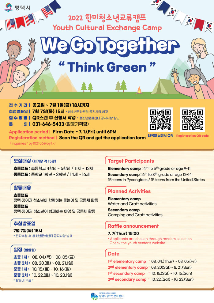[로컬세계=김병민 기자]경기 평택시가 (재)평택시청소년재단에 위탁 운영하고 있는 평택시청소년문화센터는 2022년 한미청소년교류캠프 “We Go Together”에 참가할 청소년을 모집한다.