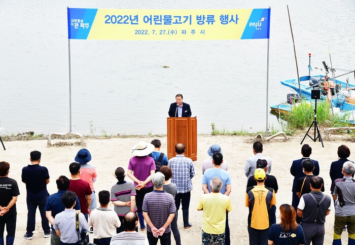 ▲ 황복 치어 방류 행사에서 김경일 파주시장이 격려사를 하고 있다. 파주시 제공 |