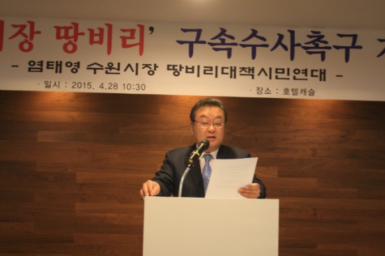 수원시 12개 시민단체로 구성된 ‘염태영수원시장땅비리대책시민연대’는 지난 28일 호텔캐슬에서 성명서를 발표하고 “(염 시장은) 시장이라는 직위를 이용, 본인과 친인척 등에 천문학적인 재산상 이득을 취할 수 있는 대규모 개발계획을 추진하는 등 비도덕적이고, 몰염치한 행동을 하고도 속 시원한 대답을 내놓지 못하고 있다”며 “120만 시민과 3000여 공직자들에게 한 점 의혹 없이 사실 규명과 함께 입장을 밝히라”고 주장했다.