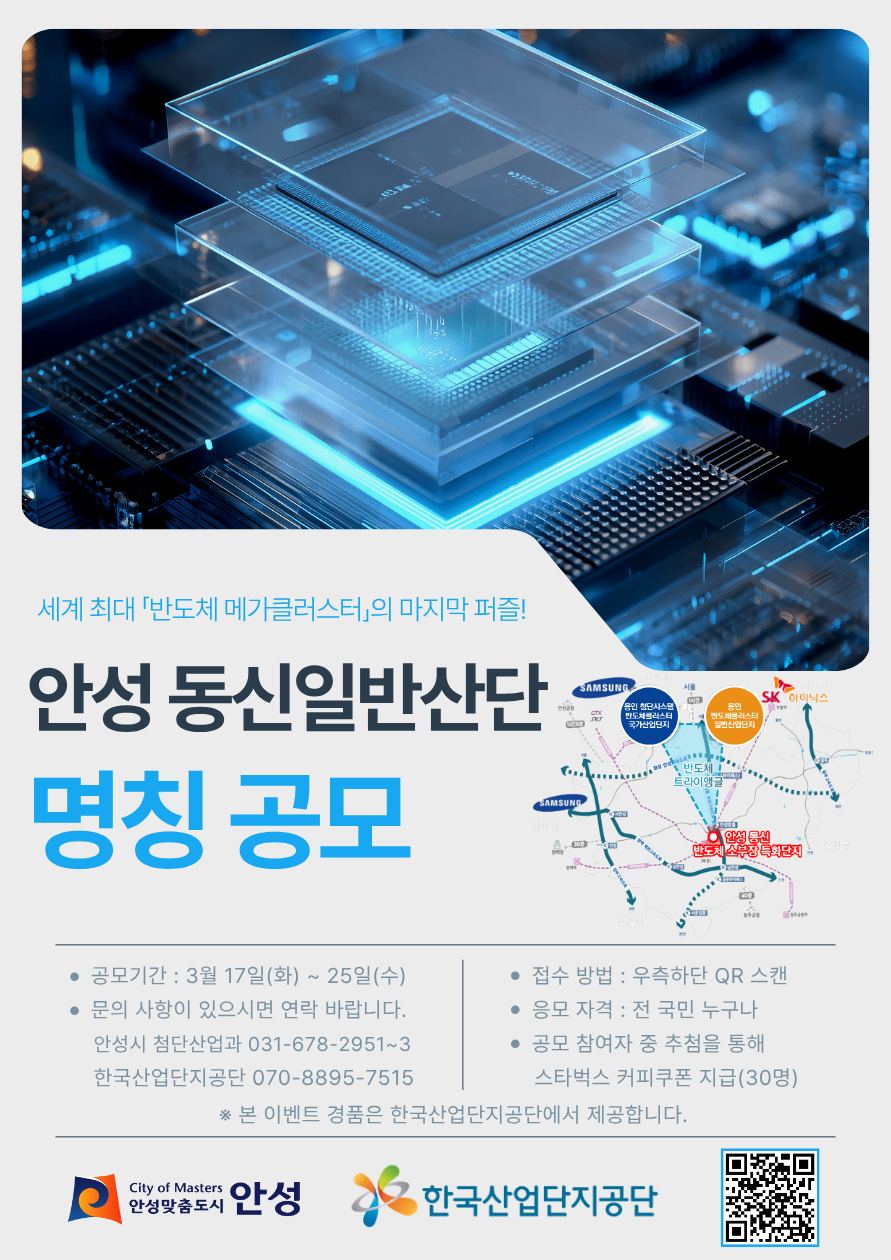 이번 공모는 반도체 산업 중심지로서 안성시의 위상을 강화하고, 산업단지 경쟁력을 높이기 위한 전략적 브랜딩 작업의 일환으로 풀이된다.