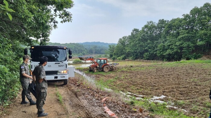 이에 지난 13일부터 제1사단 화학대대가 8톤 급수차 1대를 포함해 급수차 총 5대를 동원해 농업용수를 공급하고 있다.