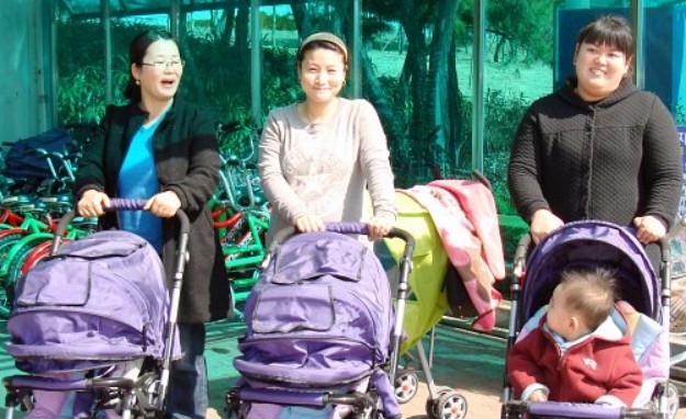 ▲익산시 주부들이 공원에서 대여한 유모차에 아이들을 태우고 산책에 나서고 있다. |