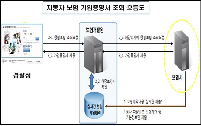 경찰청은 보험개발원 및 11개 손해보험사의 전산망과 연계하여 자동차 종합보험 가입정보를 실시간으로 확인하고 곧바로 가입증명서를 발급(출력)할 수 있는 시스템을 구축했다. 더불어 무분별한 조회 방지 및 개인정보 보호를 위해 로그기록을 저장하도록 했다.