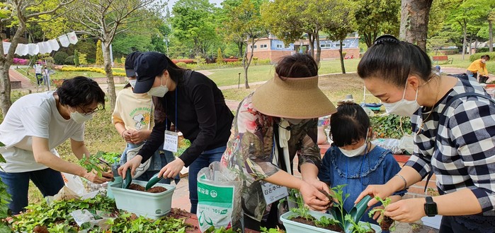 이번 행사는 코로나19로 인한 자녀 양육 부담 완화 및 가족관계 향상 지원을 위해 양육자와 자녀의 1:1 데이트로 기획했으며, 숲놀이를 통한 부모 효능감 향상 및 긍정적인 상호작용이 이루어지도록 ‘봄놀이 및 우리집 텃밭 화분 만들기’로 진행했다.