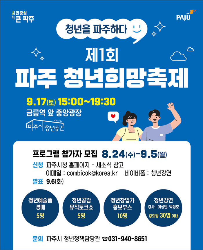 [로컬세계 = 이영원 기자]파주시(시장 김경일)는 오는 9월 17일 금릉역 앞 중앙광장에서 제1회 파주 청년희망축제를 개최한다.