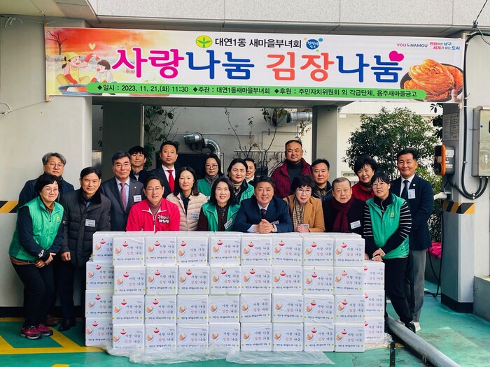 [로컬세계 부산=맹화찬 기자]부산 남구 대연1동 새마을부녀회는 지난 21일 대연1동 행정복지센터 1층 주차장에서 '사랑나눔, 김장나눔'행사를 개최했다.