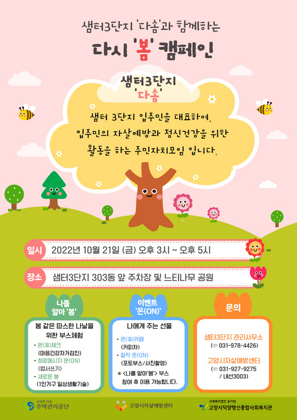 [로컬세계 = 이영원 기자]경기 고양시자살예방센터가 자살예방에 대한 관심을 높이고, 생명존중문화를 조성하기 위해 유관기관 및 주민활동가와 함께 오는 21일 샘터3단지 아파트 느티나무공원에서 캠페인 ‘다시 봄’을 진행한다.