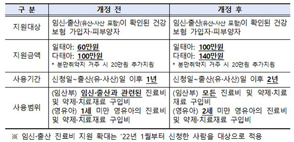 또한 사용기간이 출산(유산·사산)일 이후 1년에서 2년으로 연장되며, 지원항목은 임신·출산과 관련된 진료비 및 약제·치료재료 구입비에서 모든 진료비 및 약제·치료재료 구입비로 확대한다.