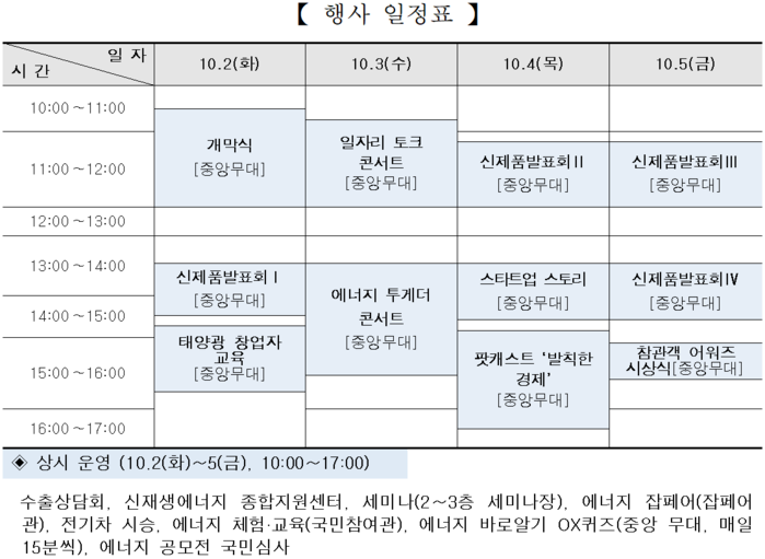 특히 3일에는 에너지 잡페어를 통해 취업한 선배와의 만남과 기업이 원하는 인재상을 소개하는 시간을 갖고 공휴일(개천절)을 맞아 에너지 투게더 콘서트를 열어 VR 퍼포먼스 등 가족 단위 참관객들을 위한 프로그램을 마련한다.