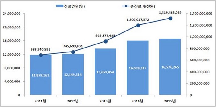 ‘충치와 잇몸질환‘의 진료 추이를 보면 진료인원은 2015년 기준 약 1658만명으로 5년 전에 비해 약 470만명(39.5%) 증가했으며 국민 3명 중 1명이 진료를 받았다. 총진료비는 지난해 기준 약 1조3195억원으로 5년 전에 비해 약 6305억원(91.5%) 증가했다.