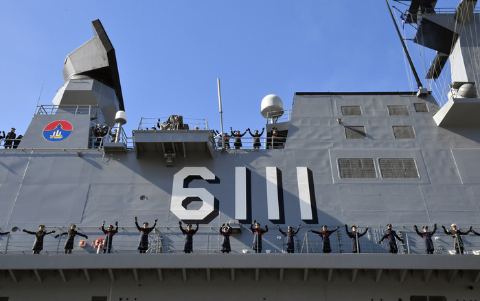 ▲함정에 오른 사관생도들과 장병들이 경례하고 있다.(해군작전사령부 제공) |