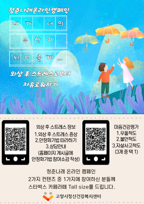 [로컬세계 = 이영원 기자]경기 고양시정신건강복지센터 청춘나래팀이 오는 23일까지 온라인 정신건강 캠페인 ‘내가 너의 우산이 되어줄게’를 진행한다.