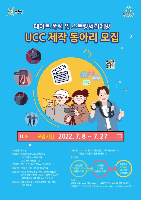 이번 사업은 폭력 예방과 시민들의 인식개선을 위한 ‘2022년 광주시 양성평등기금 공모사업’으로 보조사업자 (사)위드커리어를 선정해 추진하고 있으며 광주시민 2인 이상 단체(자조모임 포함) 또는 광주시 소재 사업장 및 학교에 재직(재학)하며 활동하는 단체는 지원 가능하다.