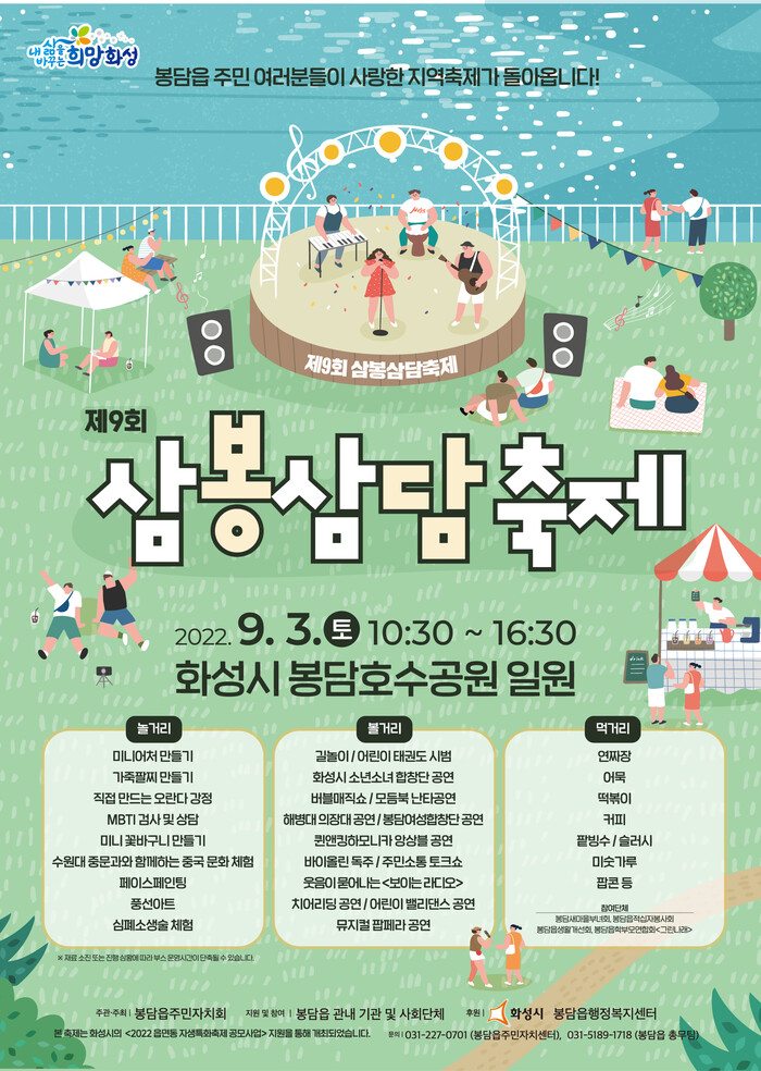 ‘2022년 읍면동 자생특화축제 지원’사업의 일환으로 진행되는 이번 삼봉삼담축제는 봉담호수공원 일원에서 진행되며 길놀이 공연을 시작으로 다양한 문화예술 동아리와 관내 기관 및 사회단체의 참여로 풍성한 볼거리와 먹거리 등을 제공할 예정이다.