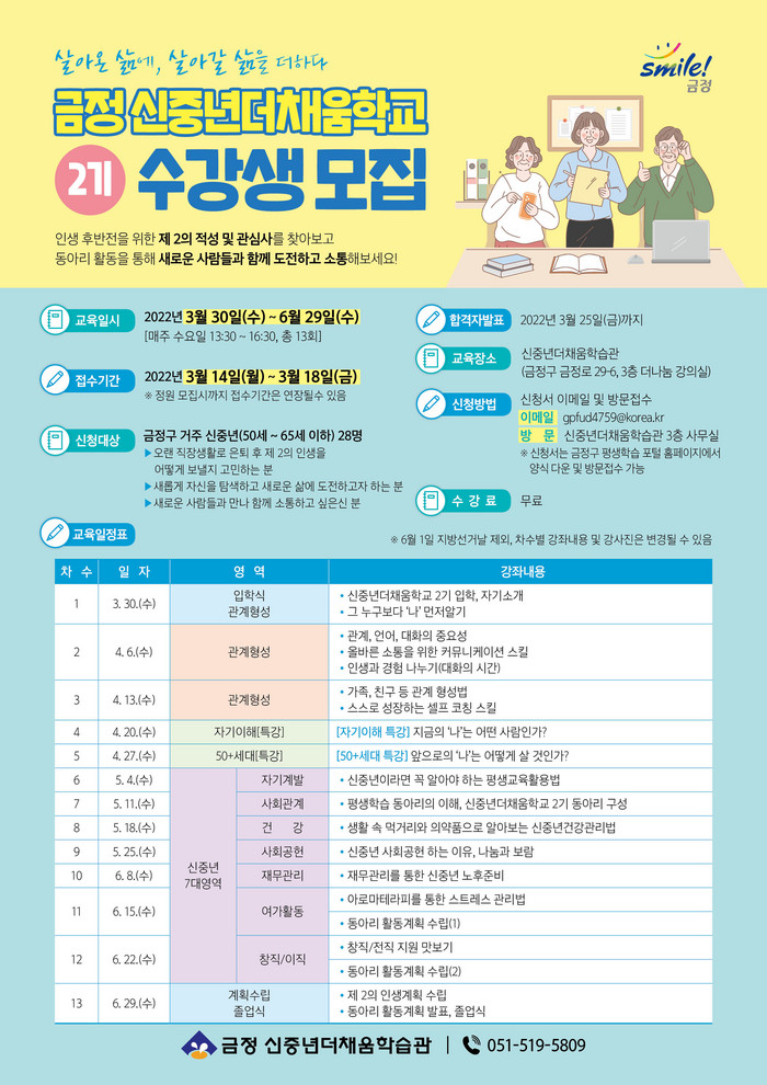 금정구 관계자는 "금정 신중년더채움학교를 통해 제2의 적성과 관심사를 찾아보고, 새로운 사람들을 만나 생각을 나눌 좋은 기회가 될 것"이라고 말했다.