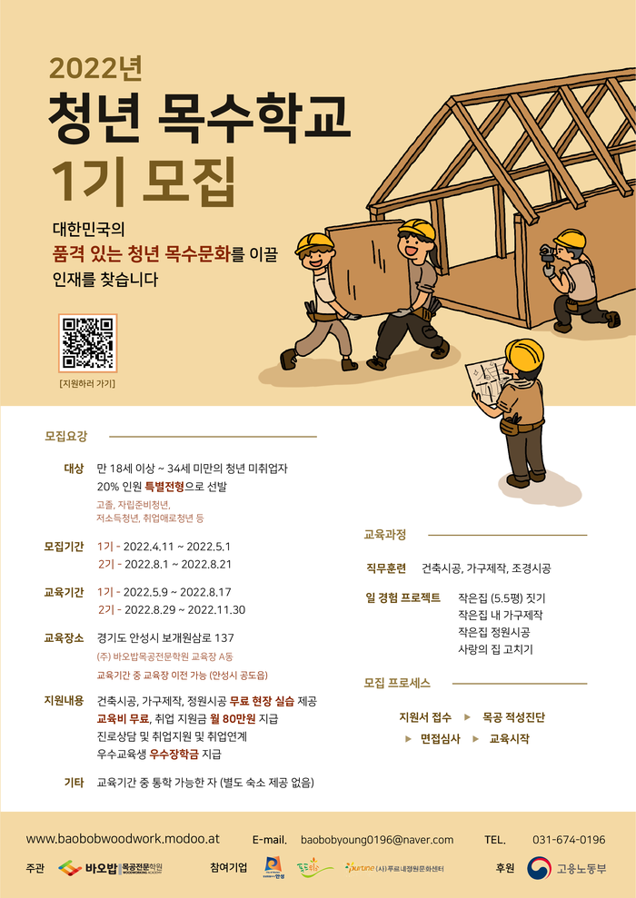 신청자격은 만 18세 이상 34세 미만의 청년 미취업자로, 자세한 내용은 홈페이지를 참고하면 되며, 기타사항은 ㈜바오밥목공전문학원 청년목수학교로 문의하면 된다.