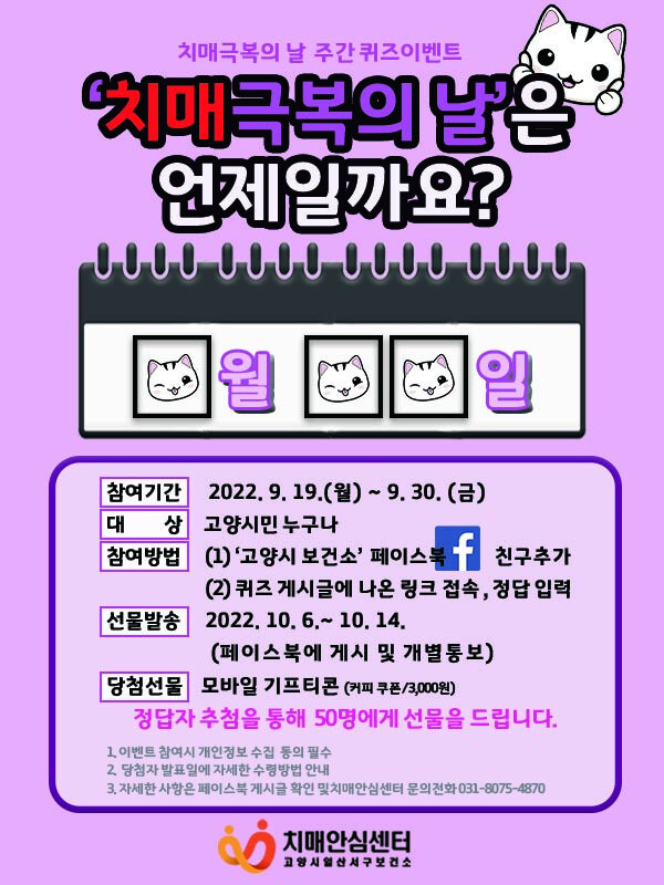 [로컬세계 = 이영원 기자]경기 고양특례시 일산서구보건소 치매안심센터가 치매극복의 날을 맞이해 ‘치타(치매타파)’ 퀴즈 이벤트를 개최한다.