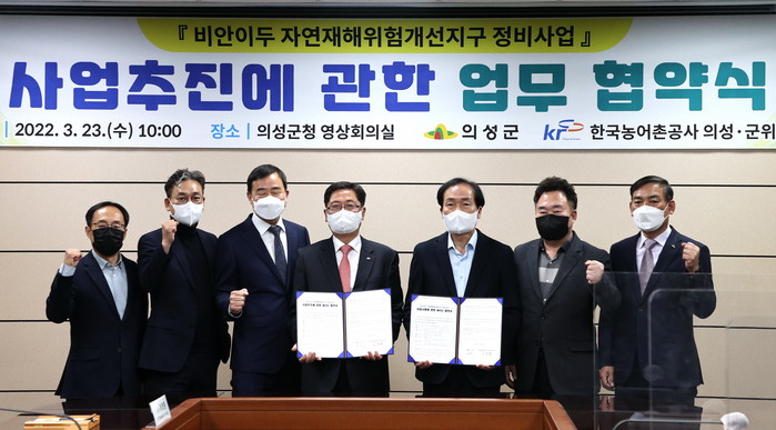 [로컬세계 박상진 기자]경북 의성군은 23일 의성군청 영상회의실에서 한국농어촌공사 의성ˑ군위지사와 비안이두 자연재해위험개선지구 정비사업 위탁 업무협약(MOU)를 체결했다.