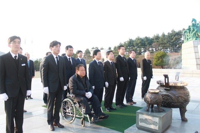 ▲더불어민주당 대전시당 소속 7명의 예비후보들과 시·구의원, 당직자 등은 24일 오전 국립대전현충원을 찾아 순국선열과 호국영령의 넋을 기리며 4.13 총선 승리를 다짐하고 있다. |