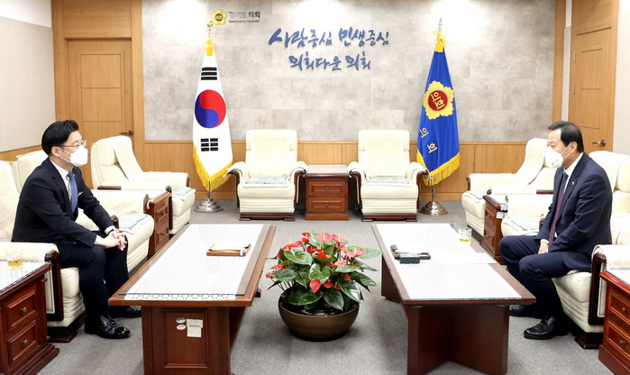 [로컬세계 고기훈 기자]장현국 경기도의회 의장(더민주, 수원7)은 26일 오전 의장 접견실에서 오병권 경기도지사 권한대행을 만나 ‘도정공백 최소화’와 ‘지방의회 인사권 독립’에 대비한 협조를 당부했다.