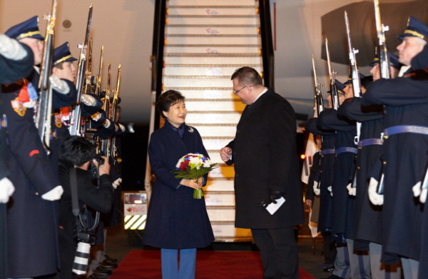 ▲ 박근혜 대통령이 1일 오후(현지시간) 체코 프라하 하벨 국제공항에 도착, 브라티슬라프 미나르 대통령실 비서 실장과 이야기를 나누고 있다.<사진출처=청와대 홈페이지> |