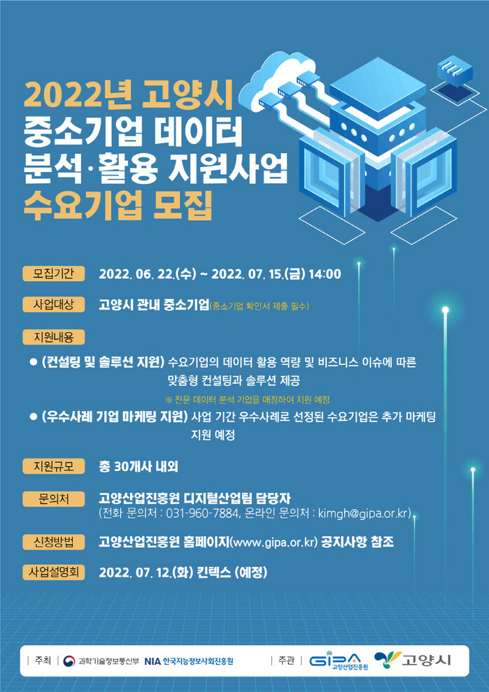 [로컬세계 = 이영원 기자]경기 고양산업진흥원(원장 오창희)에서 ‘2022년 중소기업 데이터 분석·활용 지원 사업’에 참여할 중소기업을 모집한다.