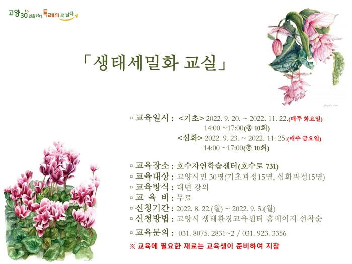 [로컬세계 = 이영원 기자]경기 고양특례시(시장 이동환) 생태환경교육센터가 2022년 생태세밀화교실 기초·심화과정을 9월 20일부터 11월 25일까지 운영한다.
